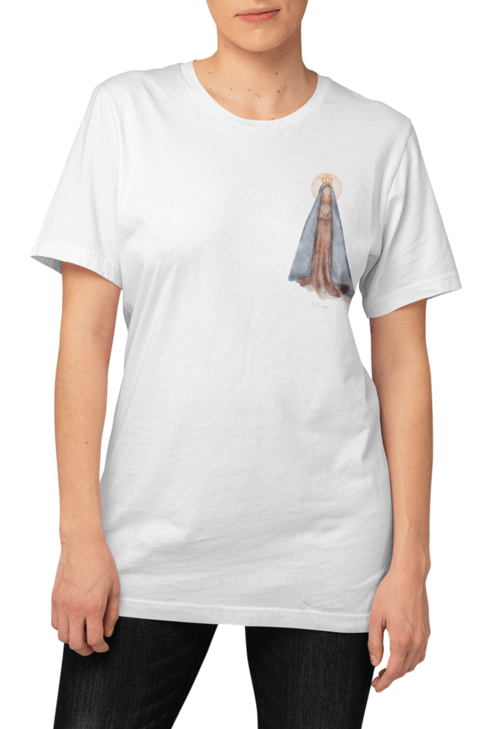 Camiseta Nossa Senhora Aparecida: Exalte sua devoção com esta peça única que celebra a Padroeira do Brasil. Uma estampa delicada e cheia de simbolismo, perfeita para expressar sua fé e gratidão.