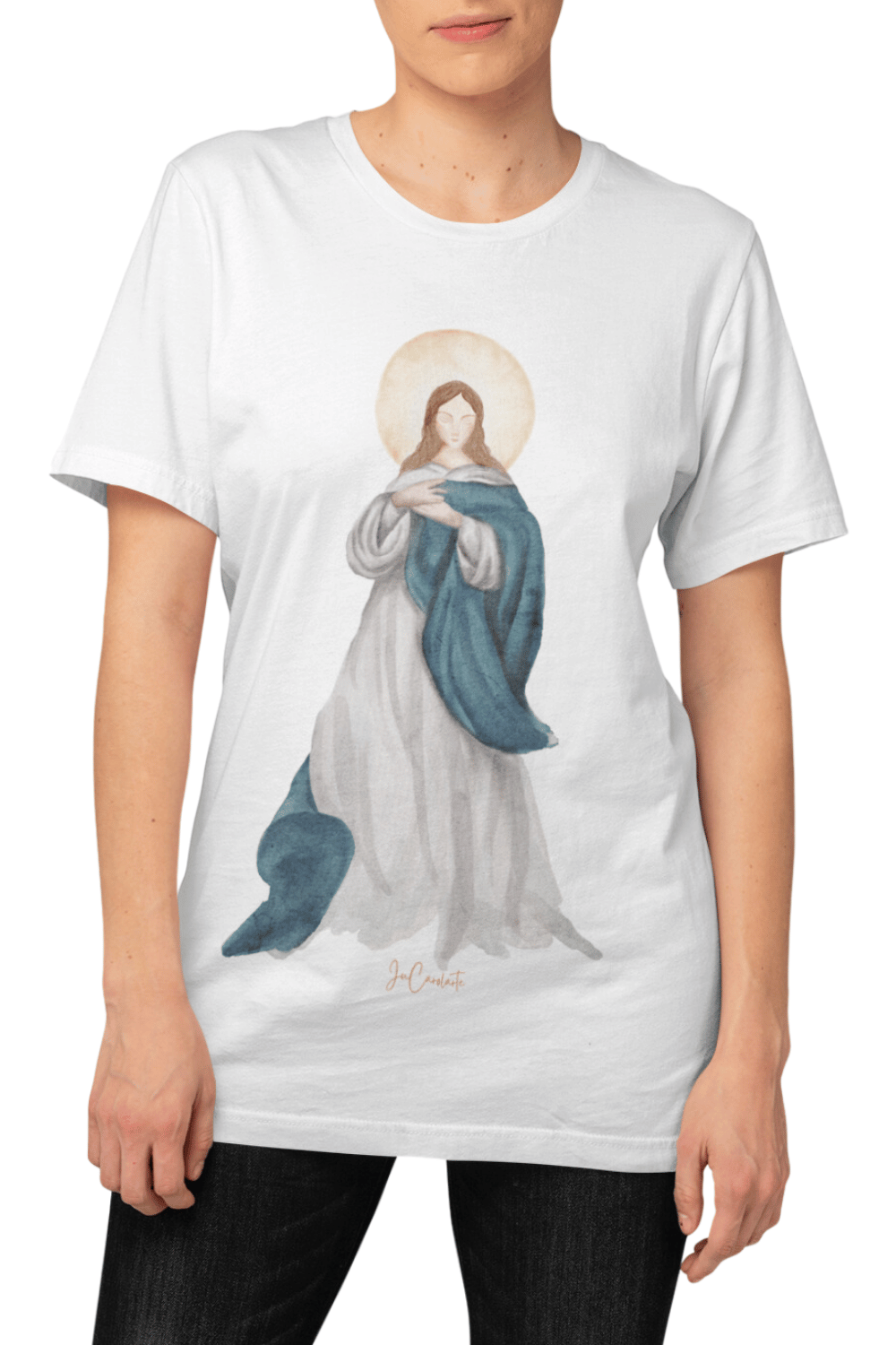 Eleve sua devoção com a delicadeza única da Nossa Senhora da Imaculada Conceição, eternizada nesta camiseta exclusiva. A estampa, cuidadosamente pintada em aquarela pela artista JuCarolarte, traduz pureza, serenidade e proteção divina. Cada detalhe foi pensado para transmitir a espiritualidade e o amor que conectam o céu à terra.