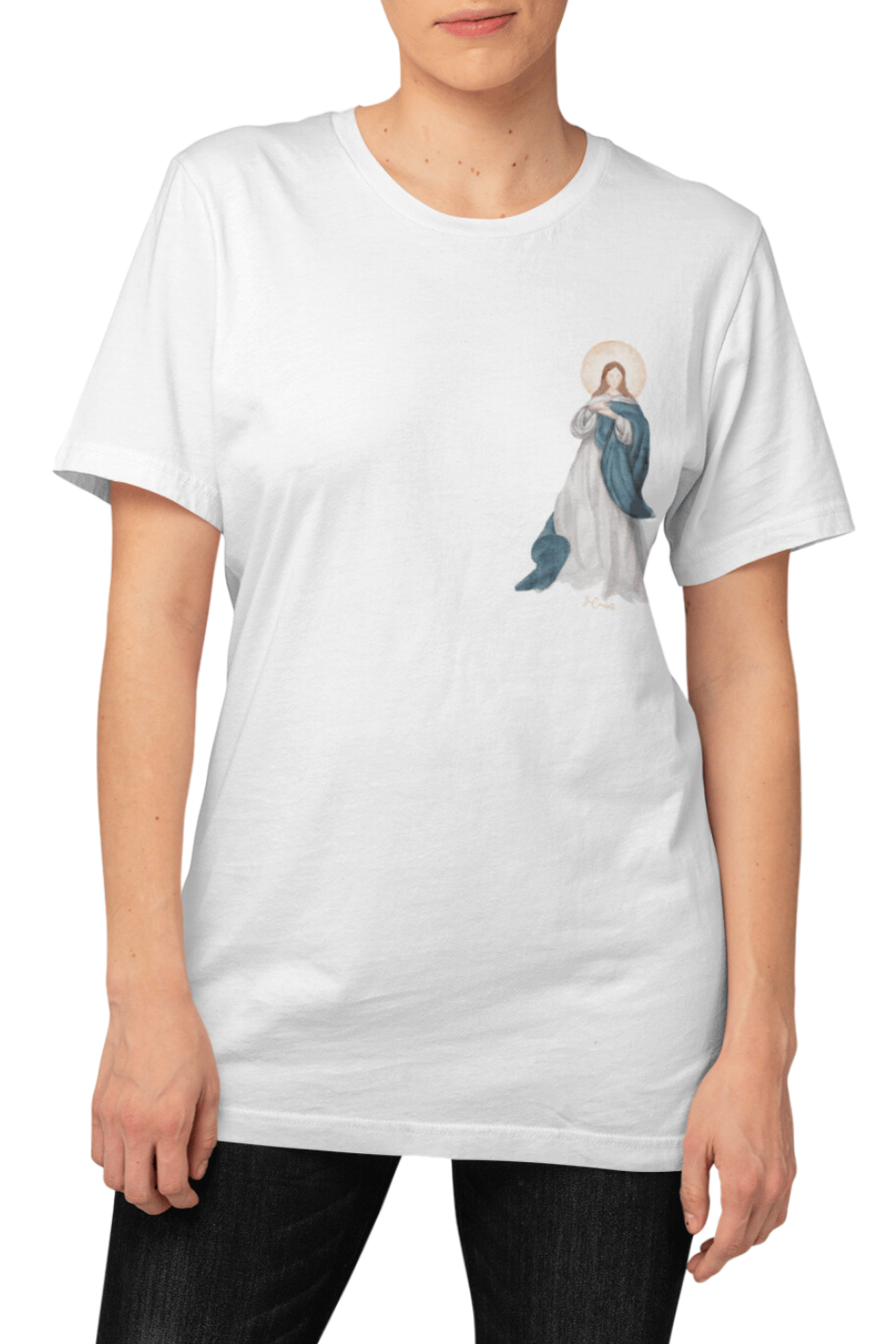 Eleve sua devoção com a delicadeza única da Nossa Senhora da Imaculada Conceição, eternizada nesta camiseta exclusiva. A estampa, cuidadosamente pintada em aquarela pela artista JuCarolarte, traduz pureza, serenidade e proteção divina. Cada detalhe foi pensado para transmitir a espiritualidade e o amor que conectam o céu à terra.
