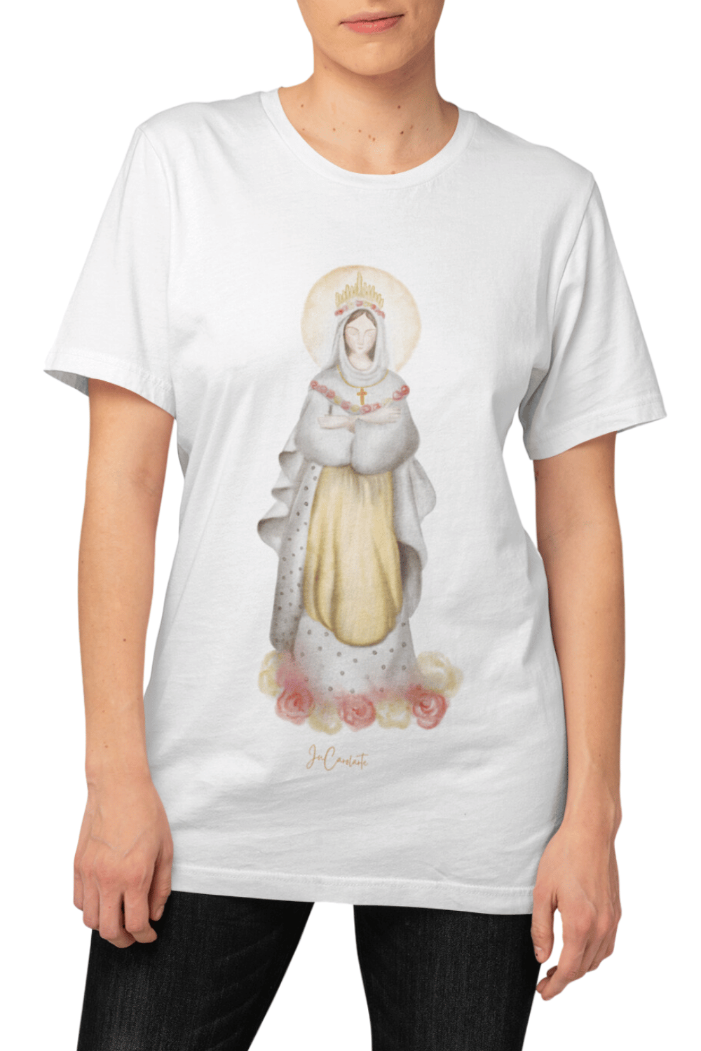 Camiseta Nossa Senhora de La Salette: Vista a graça e o mistério desta representação única de Nossa Senhora de La Salette, inspirada na aparição mariana que trouxe uma mensagem de reconciliação e esperança. A estampa, assinada pela artista JuCarolarte, reflete a espiritualidade e a profundidade desse momento sagrado.