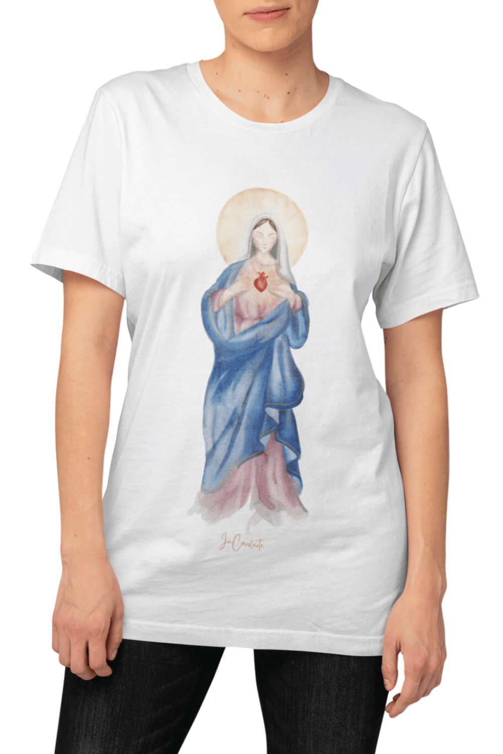 Camiseta Imaculado Coração de Maria: Uma homenagem à pureza e ao amor infinito do Imaculado Coração de Maria. A estampa exclusiva, assinada pela artista JuCarolarte, capta a essência do acolhimento e da intercessão materna de Maria.