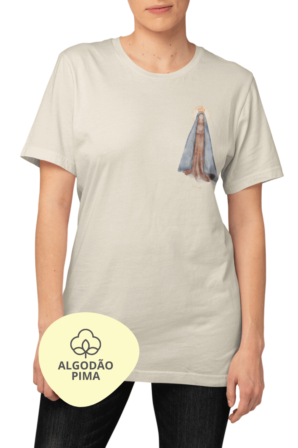 Carregue a proteção e a devoção de Nossa Senhora Aparecida, a padroeira do Brasil, com esta camiseta exclusiva confeccionada em Algodão Pima. Projetada para unir fé, conforto e elegância, a peça traz uma arte sacra aquarelada que traduz toda a beleza e serenidade de Maria.