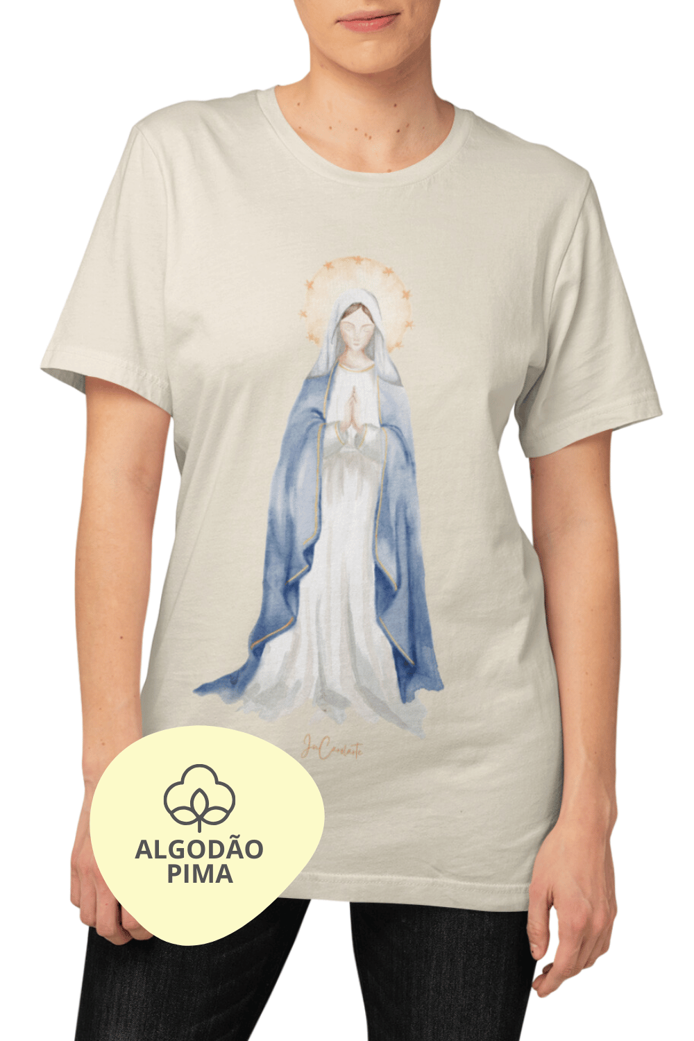 A estampa centralizada destaca Nossa Senhora das Graças em uma releitura aquarelada, com suas mãos postas em oração, envolta em um manto azul celestial com detalhes dourados. A auréola adornada com estrelas douradas simboliza sua pureza e realeza divina, enquanto sua postura serena transmite paz e proteção. O design minimalista e sofisticado torna esta peça ideal para celebrações religiosas, momentos de oração ou uso casual.