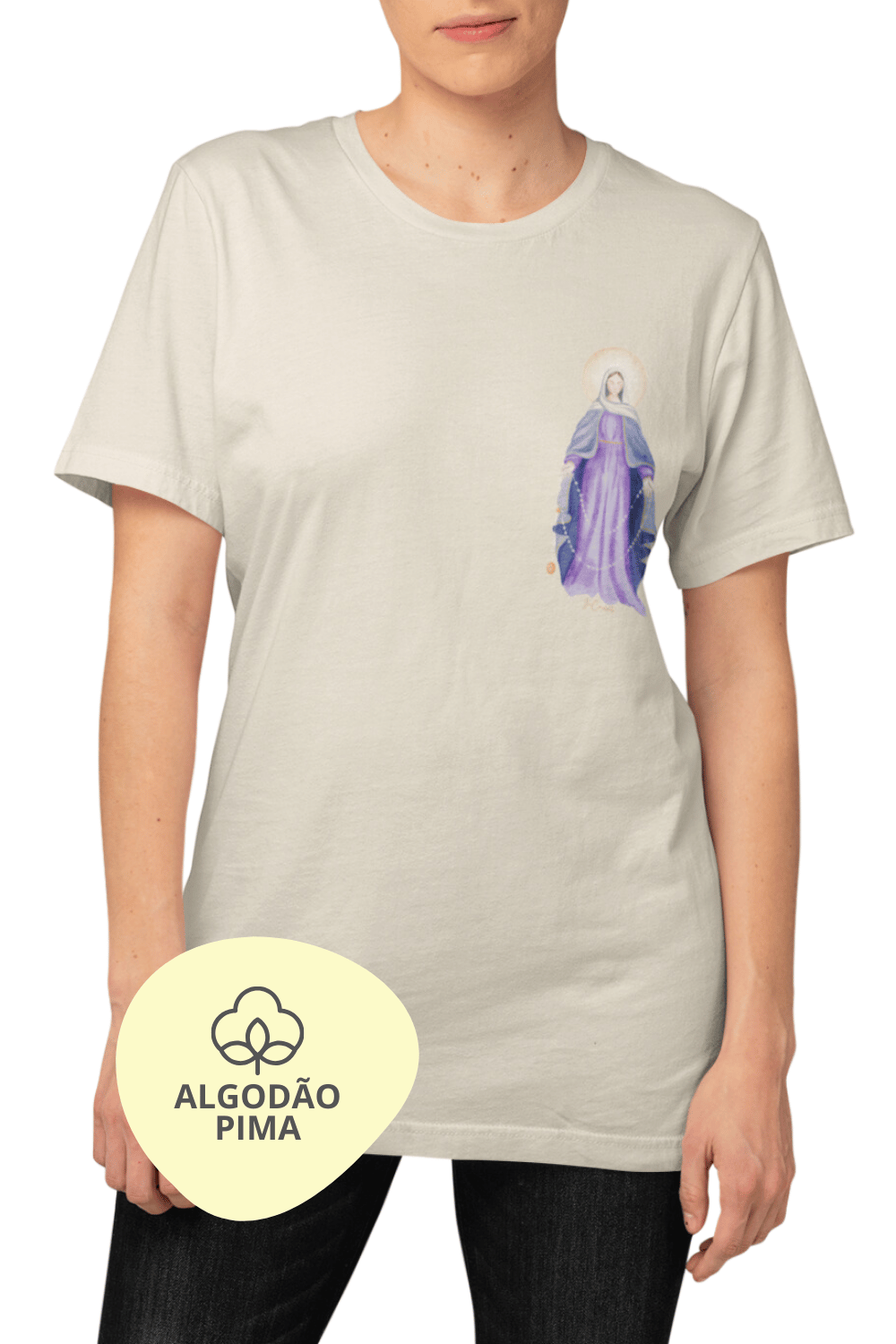 Expresse sua devoção e fé com elegância usando nossa camiseta em Algodão Pima, que apresenta a ilustração exclusiva e delicada de Nossa Senhora da Coroa de Lágrimas. Esta peça foi criada para devotos que buscam transmitir sua espiritualidade de maneira sofisticada e discreta, sem abrir mão do conforto.
