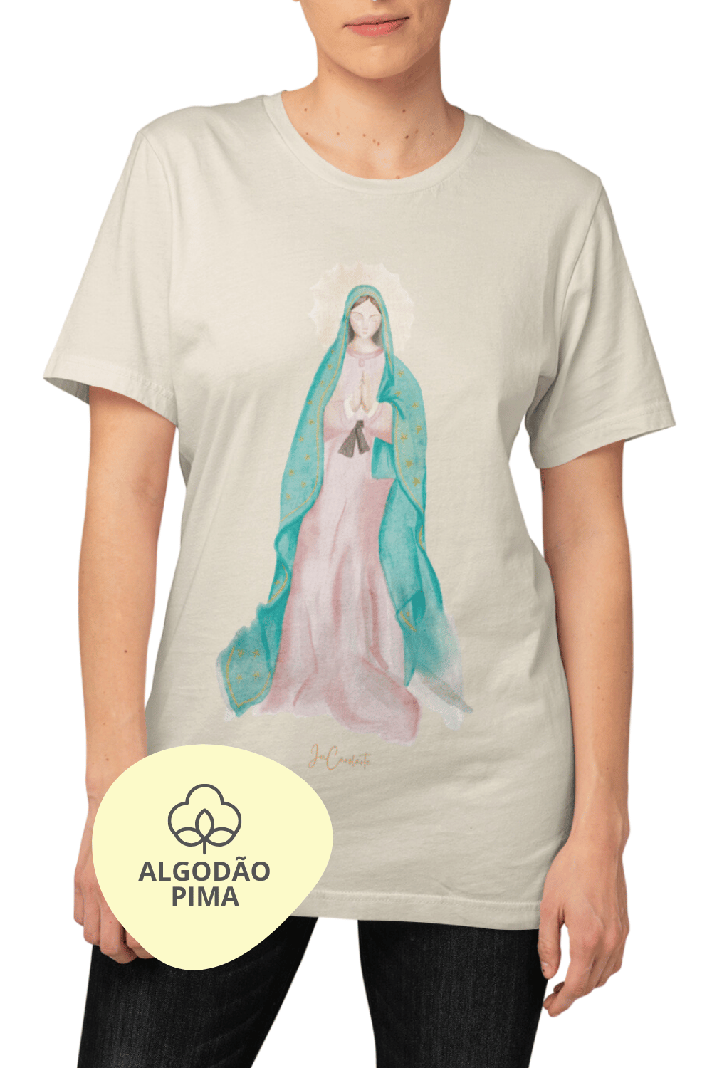 A estampa centralizada apresenta Nossa Senhora de Guadalupe em sua representação tradicional, com o manto verde adornado por estrelas douradas que simbolizam esperança e proteção divina. O vestido rosa reflete sua compaixão e amor maternal, enquanto a luz radiante ao fundo transmite sua presença celestial. Com traços suaves e em aquarela, a ilustração cria um design minimalista e sofisticado, perfeito para celebrações religiosas, momentos de oração ou o dia a dia.