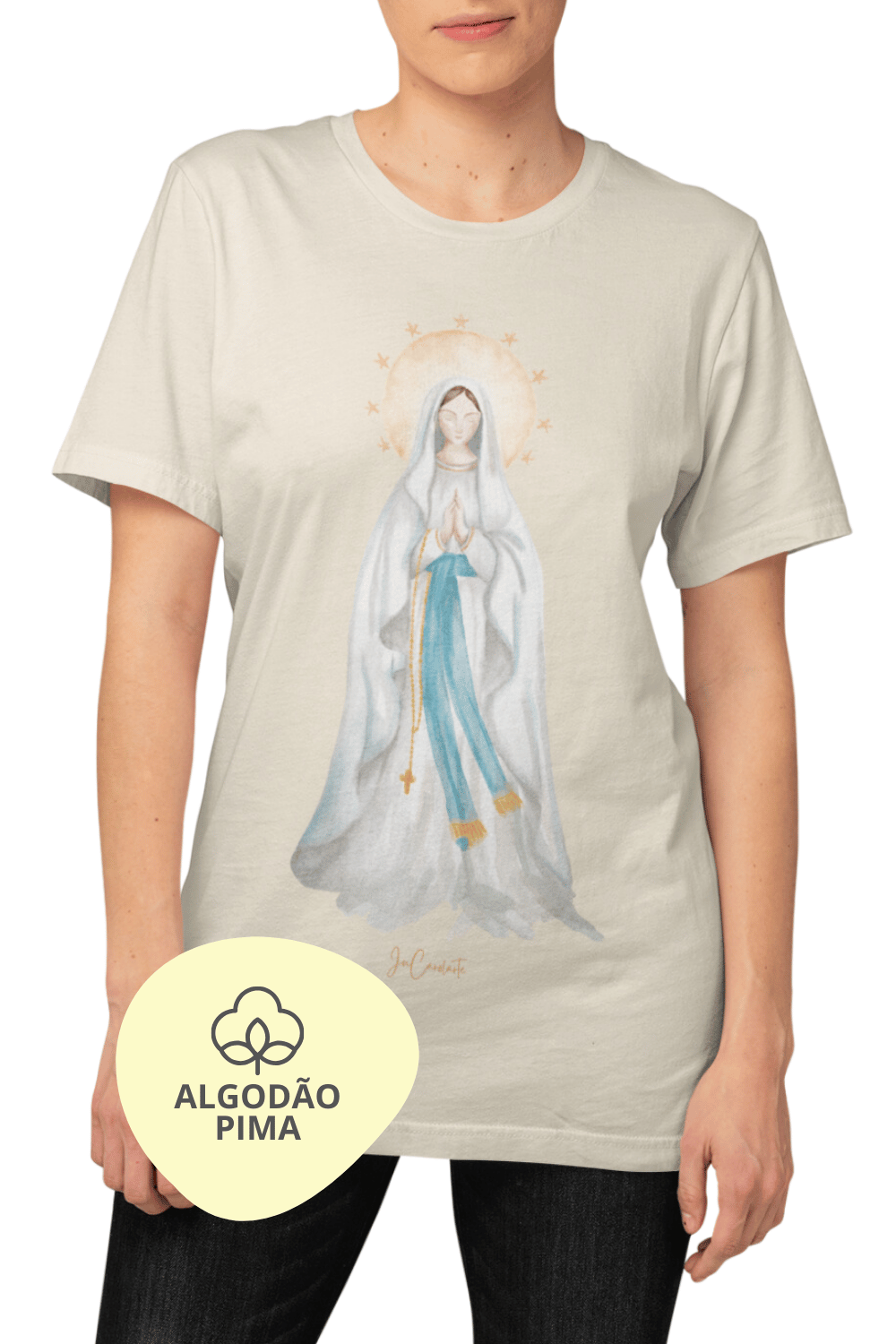 Transforme sua devoção em uma expressão de espiritualidade e beleza. Adquira já esta camiseta única e leve consigo a proteção e as bênçãos de Nossa Senhora de Lourdes!