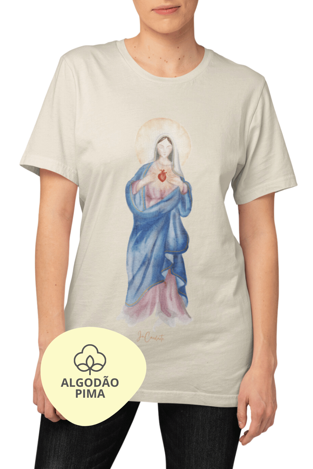 Descubra o equilíbrio perfeito entre devoção, arte e conforto com a nossa camiseta premium de Algodão Pima. Apresentando uma ilustração exclusiva e aquarelada de Nossa Senhora do Sagrado Coração, esta peça foi criada para refletir a leveza e a beleza da fé católica em um design sofisticado e atemporal.